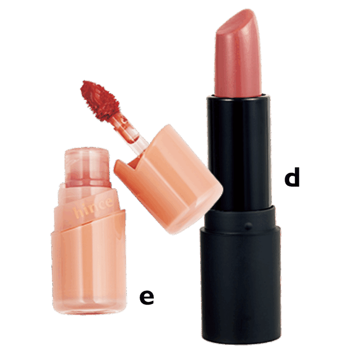 くすみピンクの目元になじむように色づくdのリップをややオーバーめに。ミニマルなサイズ感が持ち歩きにも便利なeを上から重ねて、ツヤとぷっくりとした印象を上乗せ。