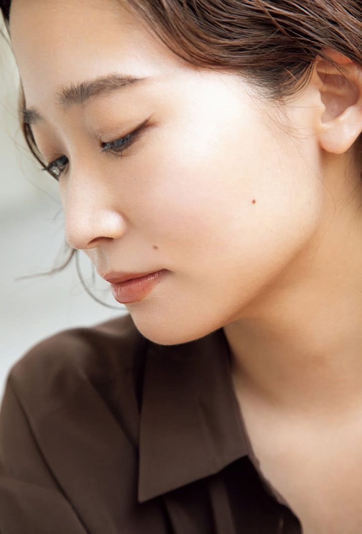 「素肌感を保ちつつもハイライトやシェーディングを仕込み、陰影を強調させて上質な肌に仕立てることで、カラーレスメイクを効果的に仕上げています。ジュエリーは華奢なゴールドで手元をリュクスに飾り、タッセルのネックレスやストーンリングでクラシックな要素をプラス。メイクとジュエリーのトータルバランスでモダンなムードを意識しました」