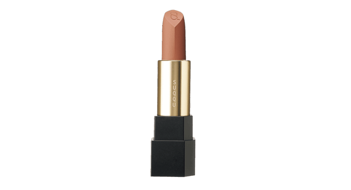顔まわりの重量感とジュエリーの存在感が印象的に映るため、軽やかに色づくようなシアーマットな質感のリップをセレクト。透け感のあるソフトベージュは直塗りするだけで様に。
