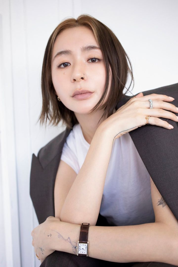 「身に着けていて高揚感があるダイヤのジュエリーや腕時計で手元をクラシックなムードに盛りたい気分。旅先で出合うジュエリーにはストーリーがあり、思い入れも深いので、最近旅に出るたびに買い足しています。ソフトマットな肌と血色をおさえたリップで作るハンサムメイクでいてこそ、ジュエリーが自分らしく映える気がします。」