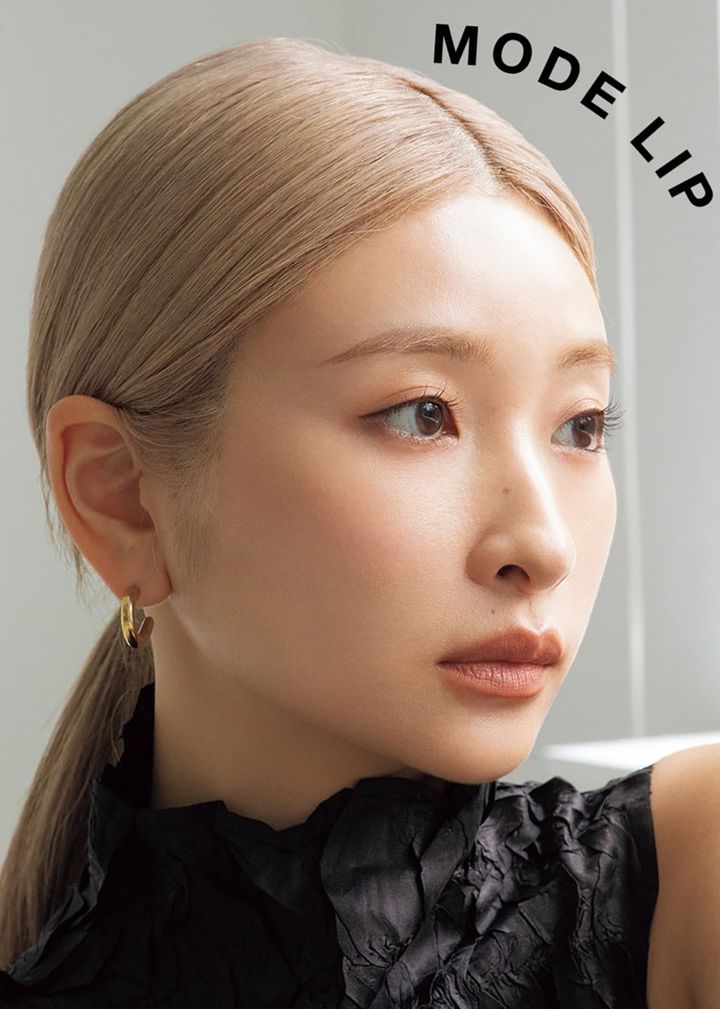 ピタッとタイトなヘアスタイルにはhのリップライナーで輪郭を整えつつ悪目立ちしないgのブラウンベージュのカラーを。セミマットな質感で唇に丸みを出すことでモードな雰囲気に。