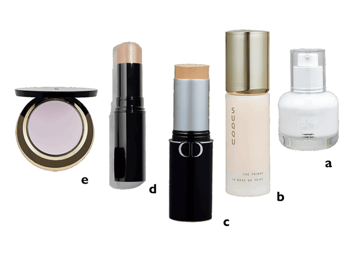 a glowのブリーザブルBBクリーム b SUQQUのザ プライマー c Diorのスキン フォーエヴァー スキン パーフェクト スティック 1N ニュートラル d CHANELのボーム エサンシエル スカルプティング e SUQQUのソフト マット セッティング パウダーは本人私物