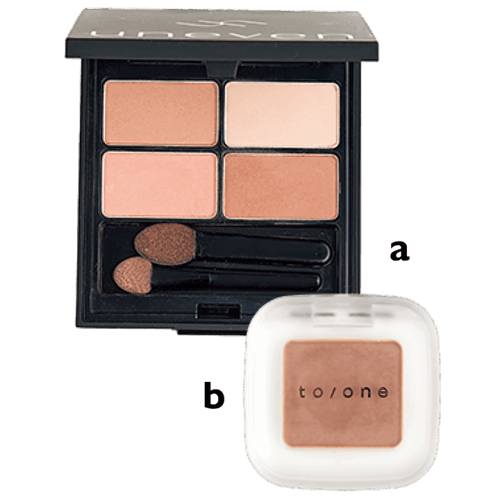 cを指でなじませてアイホールに広げ、色を入れずに印象的に見せるためbのベージュ系カラーを二重幅に重ねる。aは頰高めの位置に広く横長にのせ、内側から滲むような血色とツヤを出す。