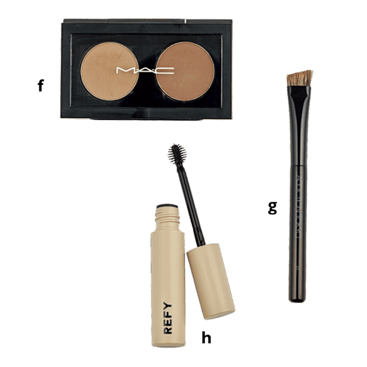 fのパウダーで眉尻のみラインをやや上に意識しながらgのブラシで1本1本眉を埋めるように描き足す。眉頭はhのマスカラで毛を立たせ、眉に立体感を出す。