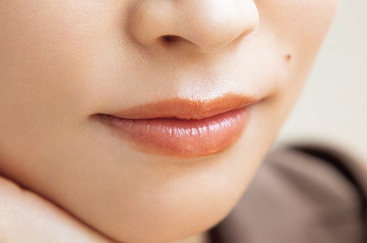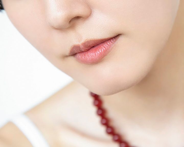 リップケアを兼ね備えたツヤのある質感で、みずみずしい血色感を生むヌードカラー。ややオーバー気味に直塗りした後、指でポンポンとぼかして均一に整える。