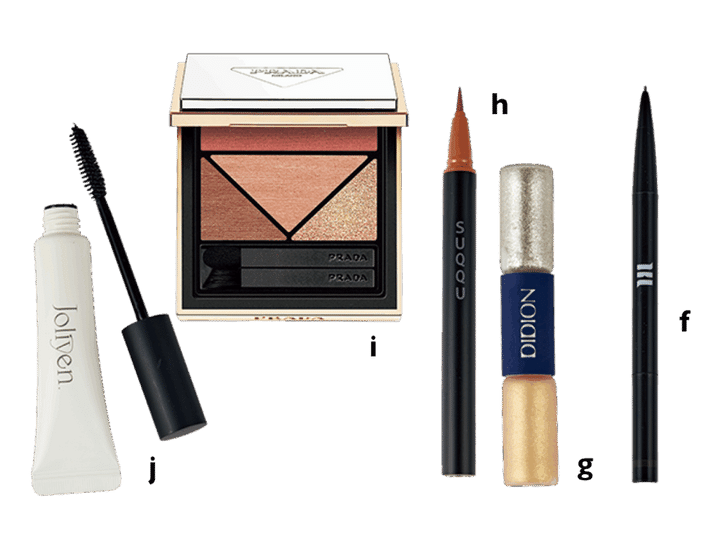 f HBLのアイブロウ エンドペンシル0.8 01 ナチュラル g DIDIONのアイカラー デュオ 01 Rainmaker h SUQQUのニュアンス アイライナー i PRADA BEAUTYのダイメンションズ マルチエフェクト アイシャドウ 08 j Joliyen.のマスカラカラーフィクサー シアーブラックは本人私物