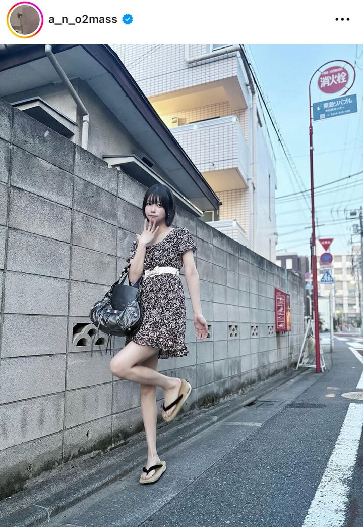 写真には、ファンから贈られたという個性的な花柄のワンピースを身につけ、街中でポーズをとるanoさんの姿が収められています。