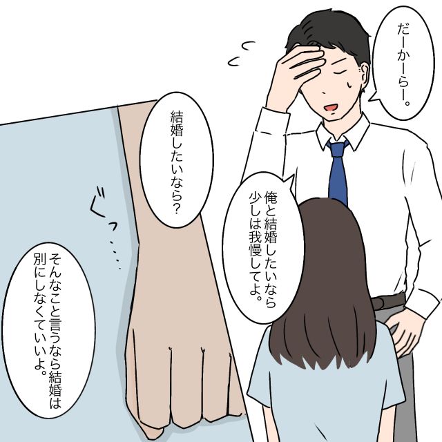 義両親の言動が失礼でも悪気があるわけではないと言うタケルは、最低限の付き合いでいいし、私が我慢すればいいと言いました。なぜ私の方が我慢するのか、不安しかありません。「だーかーらー。」とタケルはめんどくさそうにため息をつくと、「俺と結婚したいなら少しは我慢してよ」と言ったのです。結婚したいなら・・・?イラッとした私は「そんなこと言うなら結婚は別にしなくていいよ。」とキッパリ。