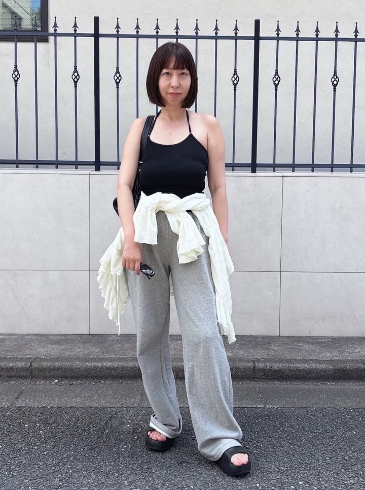 スエットもワイドシルエットにシフトすることで部屋着感のないスタイリングに。パンツがラフだからこそ、ブラックのアイテムで引き締め、カーディガンを腰巻きしてメリハリをつけるのも重要ポイント!