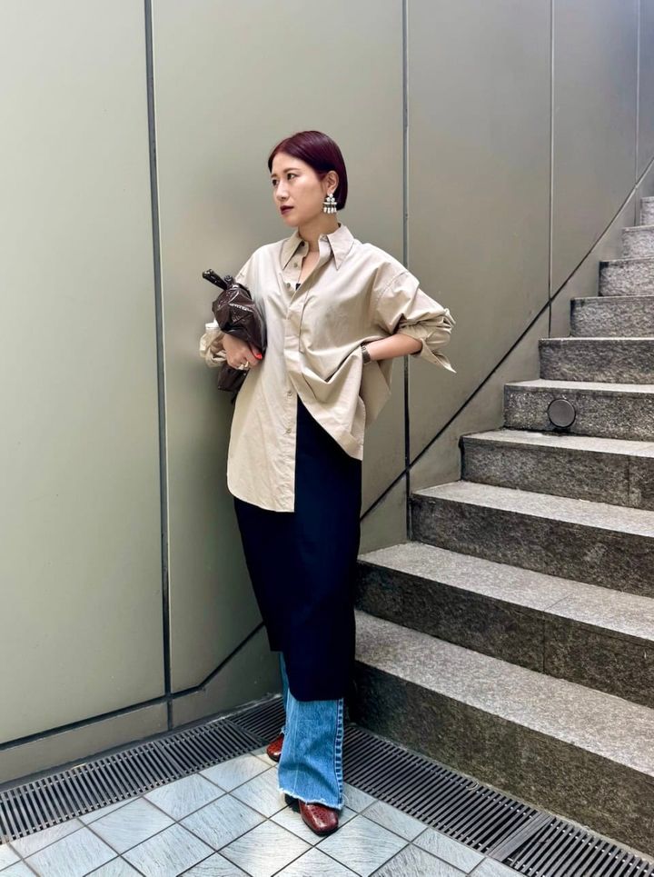 ともすると細身のパンツを選びたくなるレイヤードスタイルも、今季はフレアデニムを投入することでこなれ感たっぷりな着こなしに。カットオフしたデニムの裾が、ほどよいヌケ感を与えてくれます。