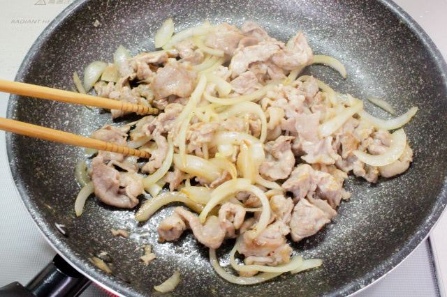 3. フライパンにサラダ油を引き、強火で熱します。豚肉と玉ねぎを入れて、玉ねぎがしんなりするまで炒めます。