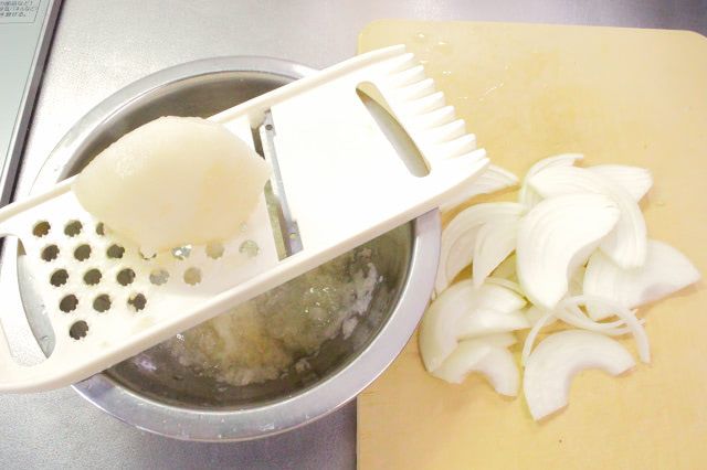 すりおろした梨を、たれに使います。玉ねぎは食べ応えが出るよう、少し厚めに切ってくださいね。