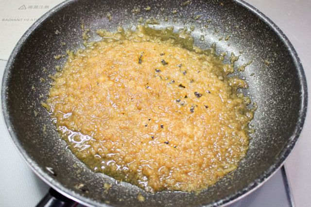 4. 具を取り出したフライパンで、1の梨おろし、しょうゆ、砂糖、コチュジャン、酒を煮詰めます。