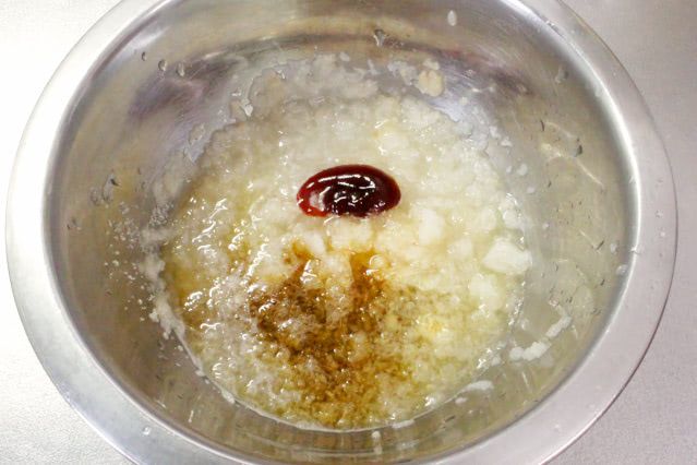 梨おろしは大根おろしよりも水分が多い感じです。コチュジャンを加えて少し韓国風の味付けにするのがポイントです。