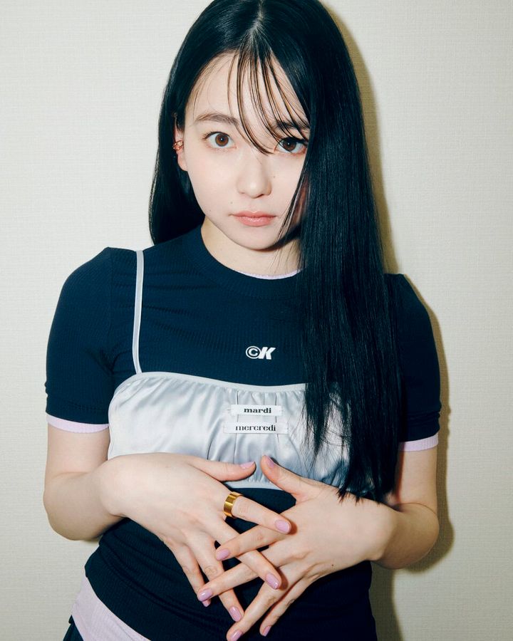 【山田】重ねて着たTシャツ各¥11,000/カルバン・クライン(カルバン・クライン カスタマーサービス)、 デニムスカート¥60,500/ディーゼル(ディーゼル ジャパン)、スニーカー¥15,400/プーマ(プーマ お客様サービス)、ビスチェ¥9,900/マルディメクルディ(マルディメクルディジャパン)、イヤカフ¥1,870、リング¥2,200/ともにアネモネ(サンポークリエイト)、ソックス/スタイリスト私物