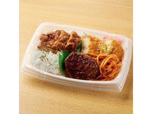 甘辛醤油で味付けした鶏から揚げや、デミハンバーグなどの肉系おかずを盛り合わせたお弁当です。 ※宮崎県、鹿児島県では取り扱いがございません。