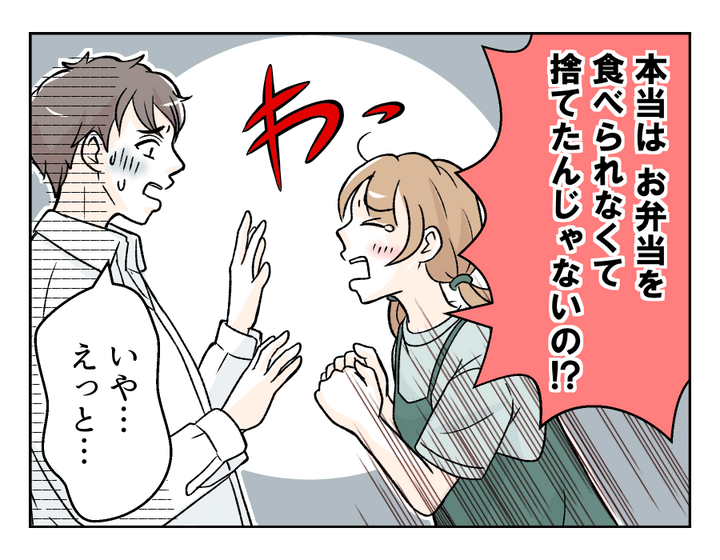 マコトさん、ついに本当のことを話してくれました。モモカさんの言うとおり、やはり捨てていたようですね。事情があるのなら、早い段階で正直に伝えていればよかったのに……そうすればきっと、お弁当を捨てるなんて最低なことはせずに済んだはずですよね。マコトさんは今日だけだと言いますが、1回であってもショックの大きな出来事。モモカさんも相当なショックを受けている様子です。味? 量? 見た目? どれもモモカさんとしてはこだわっていたはずですが、なにがマコトさんには受け入れられなかったのでしょうか……。
