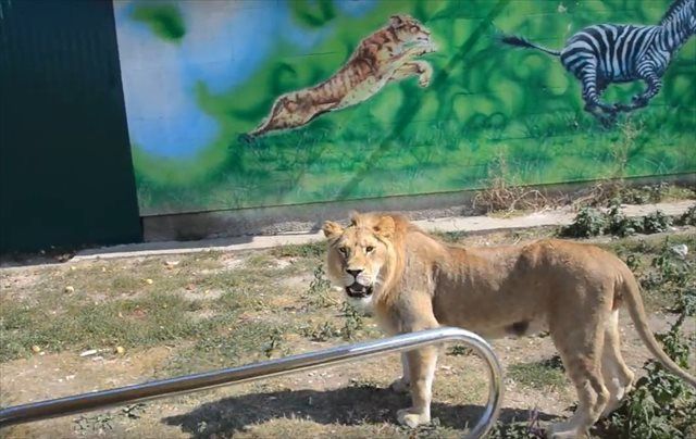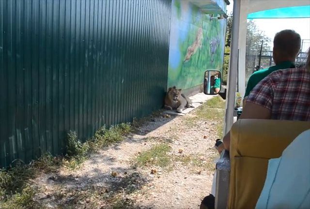 場所はクリミア自治共和国にあるサファリパーク。車でゆっくり園内を走っていると、座っているライオンの姿が見えてきました。