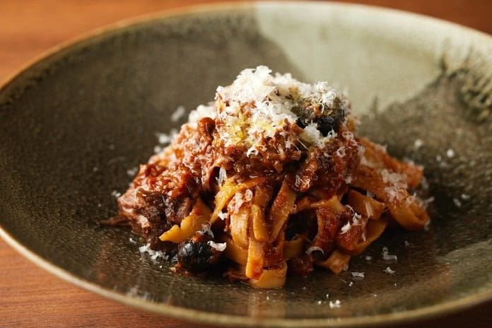 遠野産の赤身もも肉をつかった「JAM17 DINING」特製の鹿肉ボロネーゼ。香味野菜と赤ワインでじっくり煮込むことで、鹿肉の旨みを最大限に引き出し、クセのないすっきりとした後味に。濃厚ながらも軽やかな味わいは、パルメザンチーズとの相性も抜群。