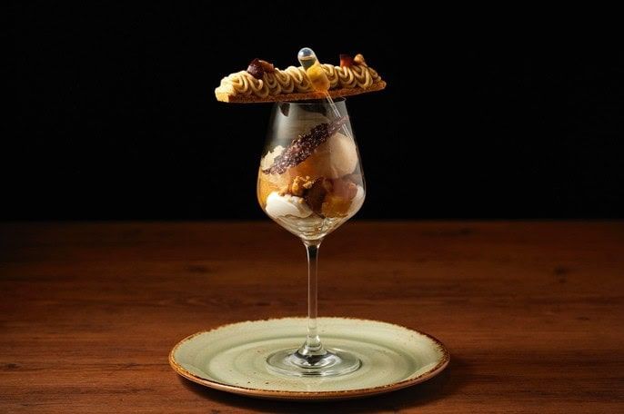 グラスの中は、カルヴァドスのシャンティとアイス、林檎のコンポートやグラニテ、栗の甘露煮、カカオニブのチュイルなど、林檎の酸味と栗の甘さのハーモニーが絶品。グラス上にはパイ生地にカルヴァドスシャンティとモンブランクリーム。添えられたスポイトの中はカルヴァドスは秋の余韻を感じるような大人のより深い味わい。
