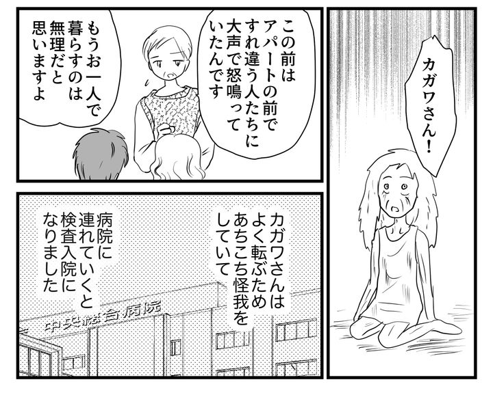 するとカガワさんが下着姿で外に出て騒いだと連絡が入ったのです。