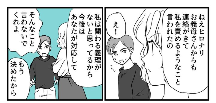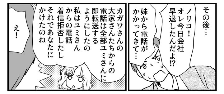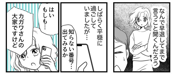 ナミエと話して、気持ちの整理ができた私。まずは私の意思をヒロナリに伝えました。そして、カガワさんの大家さんたちからかかってくる電話はすべて義妹に転送し、私は義妹からの電話を着信拒否にしました。義妹はヒロナリに頼むようになったらしく、ヒロナリは何度か会社を早退して対応しています。