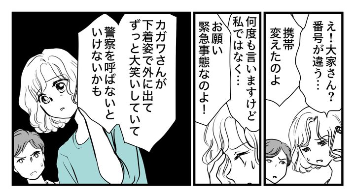 そんなある日、カガワさんの大家さんから「緊急事態だからすぐ来て!」と、電話がありました。私はすぐさまヒロナリに電話しましたが、出ないので留守電を残し、現場に向かいました。するとカガワさんは大家さん宅の玄関で放心状態になっていました。しばらくしてヒロナリも現場に来たので、2人で大家さんに謝罪しました。