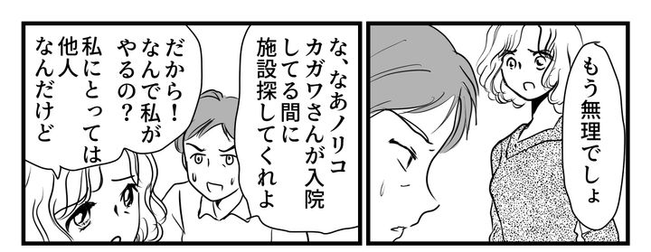 カガワさんの世話に限界を感じたヒロナリは「施設を探してくれ」と頼んできますが、私は「なぜ私が?」と怒りをぶつけて言い合いになります。