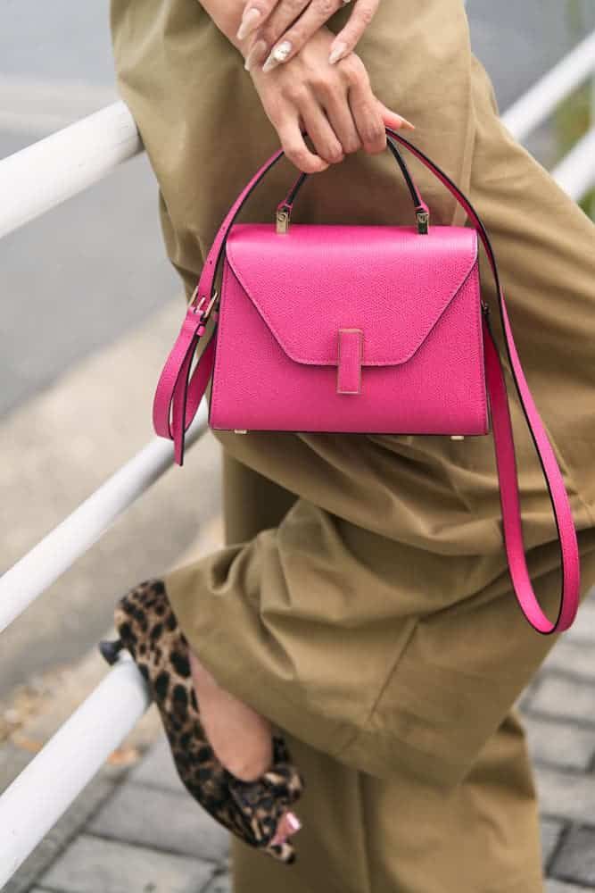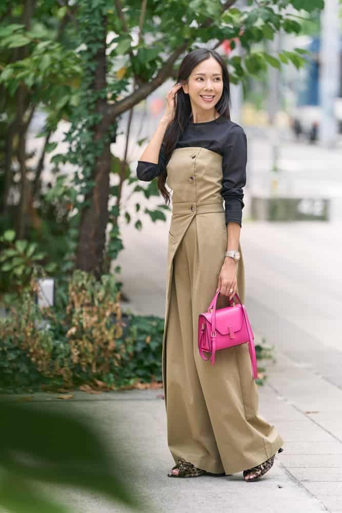 ヴァレクストラはずっと欲しいと思っていたバッグで、ハワイ旅行の時に大好きなビビットピンクに一目惚れして購入しました。差し色にちょうど良いサイズ感もお気に入りです。友達とテラスランチに行く時は、座っている時もポイントになるアシンメトリーデザインが可愛いオールインワンを主役にコーデを組みました。スタイルアップ見えするベージュのオールインワンに、黒のシースルートップスをインして重くなりすぎないように。足元は秋らしいレオパード柄の靴を合わせて、バッグのカラーとの合わせを楽しんでいます。