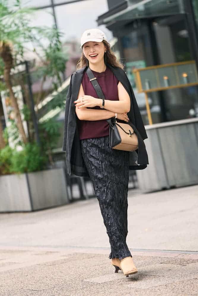イジィデのバッグは2個目で子どもの行事の多さなどから1つ目はブラックを購入。今は子育ても少し落ち着きバッグだけでも自分の好きな色を持ちたい! と大好きなピンクを選びました。サイズ感も可愛く、合わせるシルクバンドで雰囲気を変えられるのも気に入っています。ツヤ感あるサテン地のプリーツスカートに透け感とラメ感が可愛いニットトップスを合わせて“ほぼクロ”でもメリハリあるキレイめコーデに。ボリュームサンダルを合わせて抜け感をプラスしています。