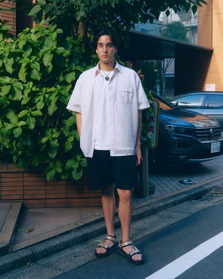 3. 【スナップ】2025年晩夏の鉄板コーデは透け感あるシアー素材のシャツにショーツとサンダルを合わせて