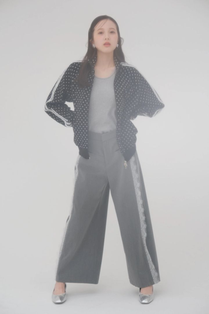 黒ドットレーストラックジャケットは着回し。グレーサイドレースパンツ 9,900円/PELLICULE カチューシャ 8,030円/CA4LA イヤリング 7,350円/アビステ シルバーパンプス 8,250円/RANDA タンクトップ/スタイリスト私物