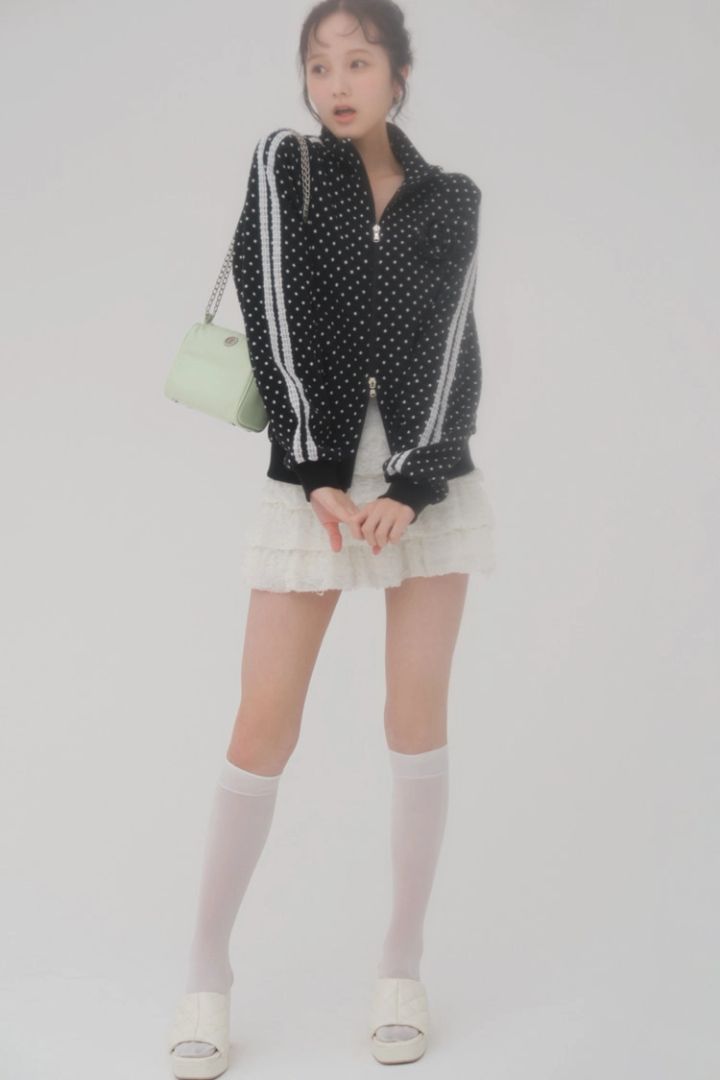 黒ドットレーストラックジャケット 20,430円、白フリルティアードミニスカート 9,680円/ともにCRANK(HANA KOREA)イヤリング 7,700円/アビステ チェーンバッグ 48,620円/minitmute(HANA SHOW ROOM)キルティングサンダル 13,200円/RESEXXY シアーソックス/スタイリスト私物