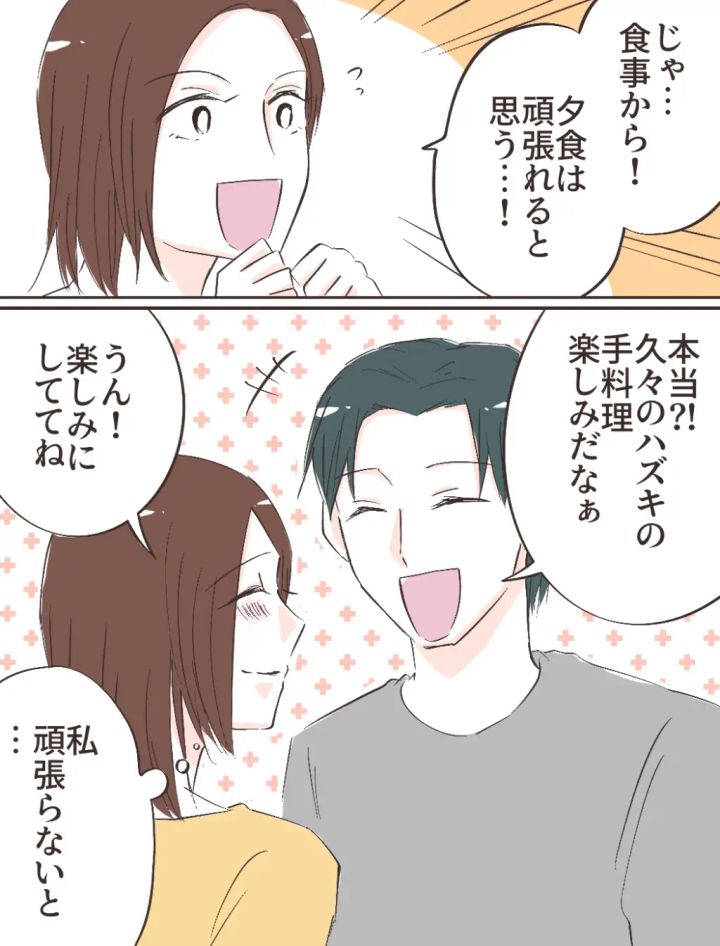 「じゃ・・食事から!夕食は頑張れると思う・・!」と私が張り切って言うと、リヒトさんは「本当?!久々のハズキの手料理楽しみだなぁ」ととても喜んでくれ、私は「うん!楽しみにしててね」と答えながらも心の中で「私、頑張らないと・・」と意気込みました。