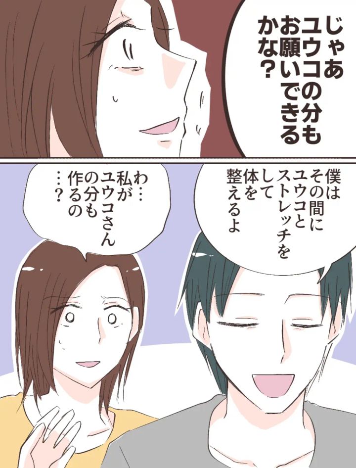 しかし、次のリヒトさんの言葉に私は驚きました。リヒトさんは「じゃあユウコの分もお願いできるかな?」と当然のように言ったのです。「僕はその間にユウコとストレッチをして体を整えるよ」と平然と言うリヒトさんに困惑しつつ、私は「わ・・私がユウコさんの分も作るの・・?」と確認しました。