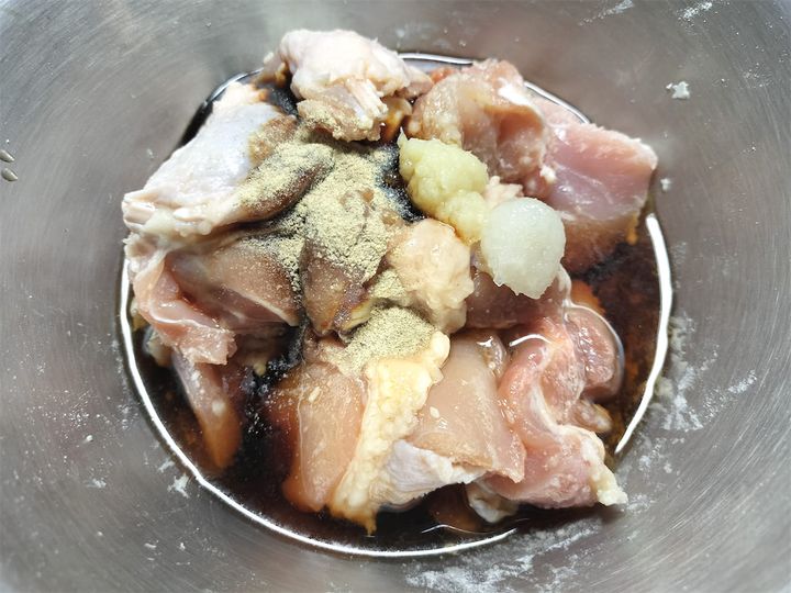 1. ボウルに鶏肉を入れ、塩麹パウダーを加えてよく揉み込みます。