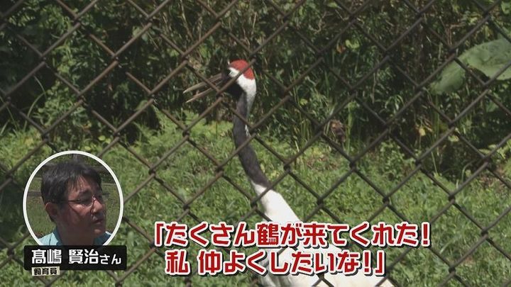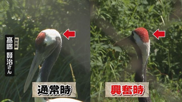 飼育員 高嶋さん:「女の子で独身なんですよ。人間の男性が来ると人と鶴との区別がついていないので『たくさん鶴が来てくれた!私仲良くしたいな』そういうことで興奮している頭の赤なんです」