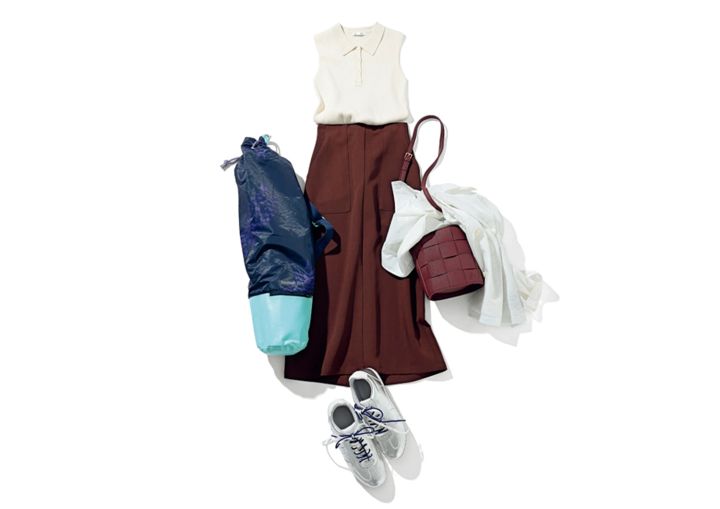 ニットポロアンサンブル(ノースリーブ)¥3,990、スニーカー¥2,990/ともにGU シアーブルゾン¥37,400/アンクレイヴ(オンワード樫山) タイトスカート¥5,489/ロペピクニック(ジュン) バケツバッグ¥6,996/デッサン(ワールド) ヨガマット/編集部私物