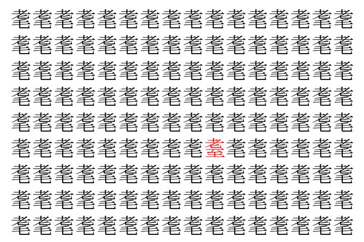 画像の中には、「耄」という漢字が縦に9行、横に16個並んでいます。 全部で144個となりますが・・・、そのうち1つは「異なる漢字」となってますよ!!
