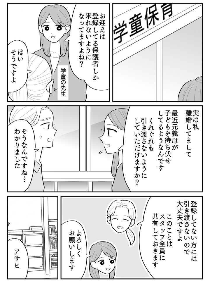 ひとまず考えつくかぎりの対策をします。まずは学童に事情を説明して、絶対に元義母には引き渡さないようお願いしました。朝はギリギリまで出社を遅らせて人の多い通学路まで送り、アサヒが1人になることがないようにしました。