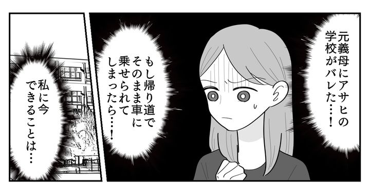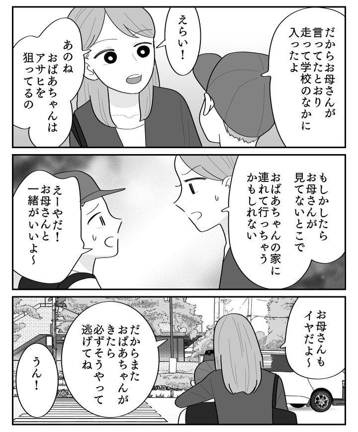 しかしまたしても待ち伏せしていた元義母は、アサヒに「写真を撮ろう」「一緒にご飯を食べよう」と迫ってきたそうです。このままだと元義母がなにをしてくるかわかりません。アサヒには怖い思いをさせたくなかったのですが、私はついに「おばあちゃんから逃げてほしい」と伝えたのでした。
