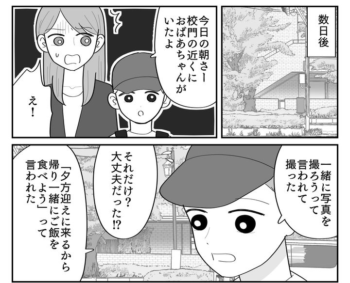 私はミキ。3年前に離婚し、フルタイムで働きながら息子のアサヒ(小3)を育てています。現在は2ヶ月に1回、父子面会の機会を設けています。面会にはアサヒの希望で私も同行しており、元夫の方は必ず元義母がついてきます。するとある朝アサヒが学校へ向かうと、元義母に待ち伏せされていました。住所を教えていないのに、なぜ学校がわかったの……!? 最近は元義母のアサヒへの執着が度を超していると感じて、直接の連絡を断ったところだったのです。