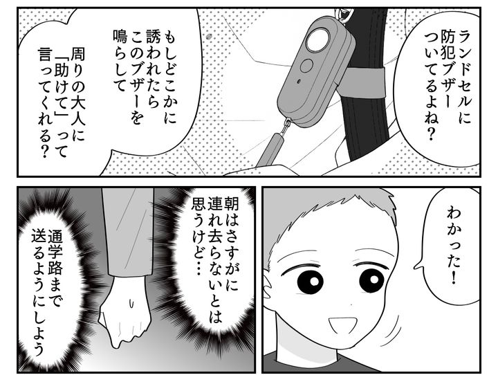 さすがの元義母も、まさか連れ去りまではしないと思いますが……。私は夕方お迎えに行く学童に事情を説明し、朝は人目の多い通学路まで送ることにしました。そしてアサヒには万一どこかに誘われてもついて行かないこと、無理やり連れて行かれそうになったら防犯ブザーを鳴らすよう伝えたのです。