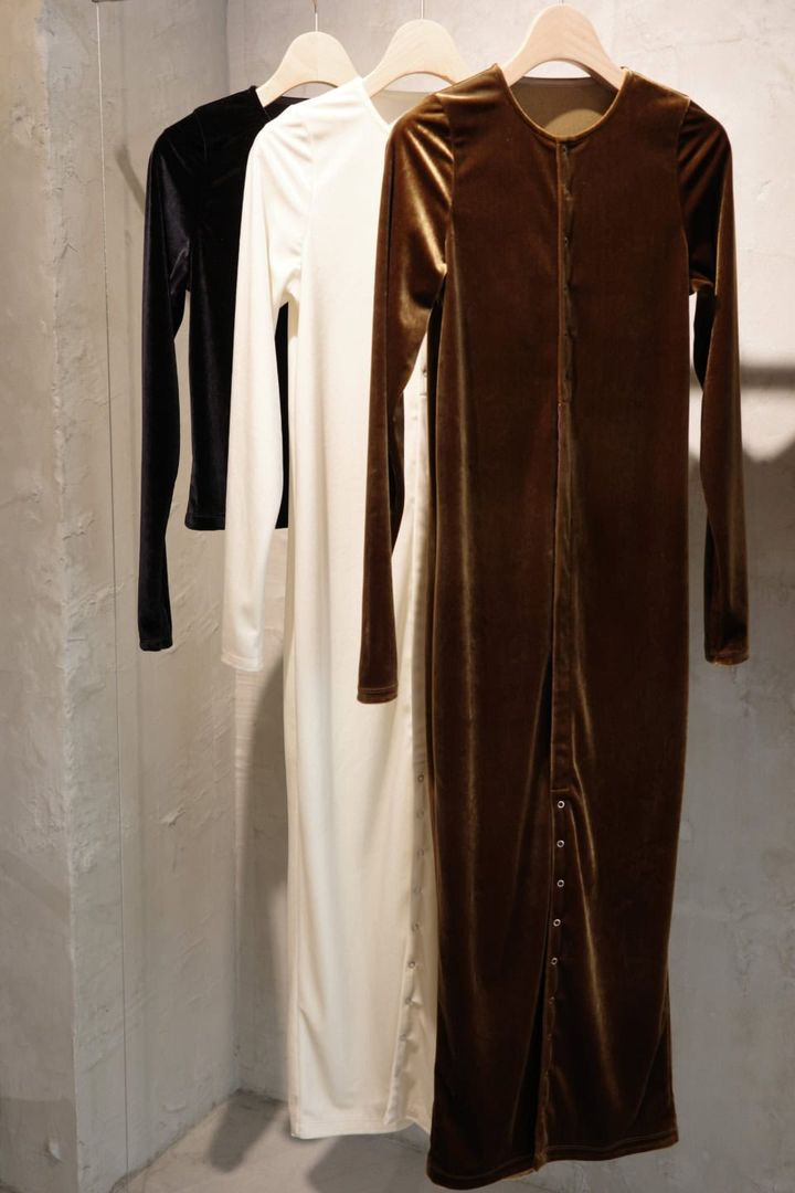 「着たときのシルエットが美しいベロアのワンピース。アームが細身に見えますが、ゆとりを持って着られるサイズ感です」ワンピース各¥64,900(全てジュンミカミ/ikasa.)