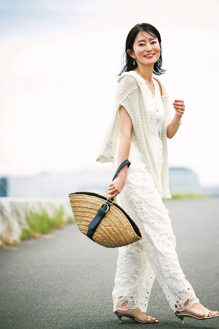 「タンクトップとサマーニットでレースの清涼感を後押し。オールホワイトでもワンピよりメルヘンにならず大人のリゾート着にも最適」