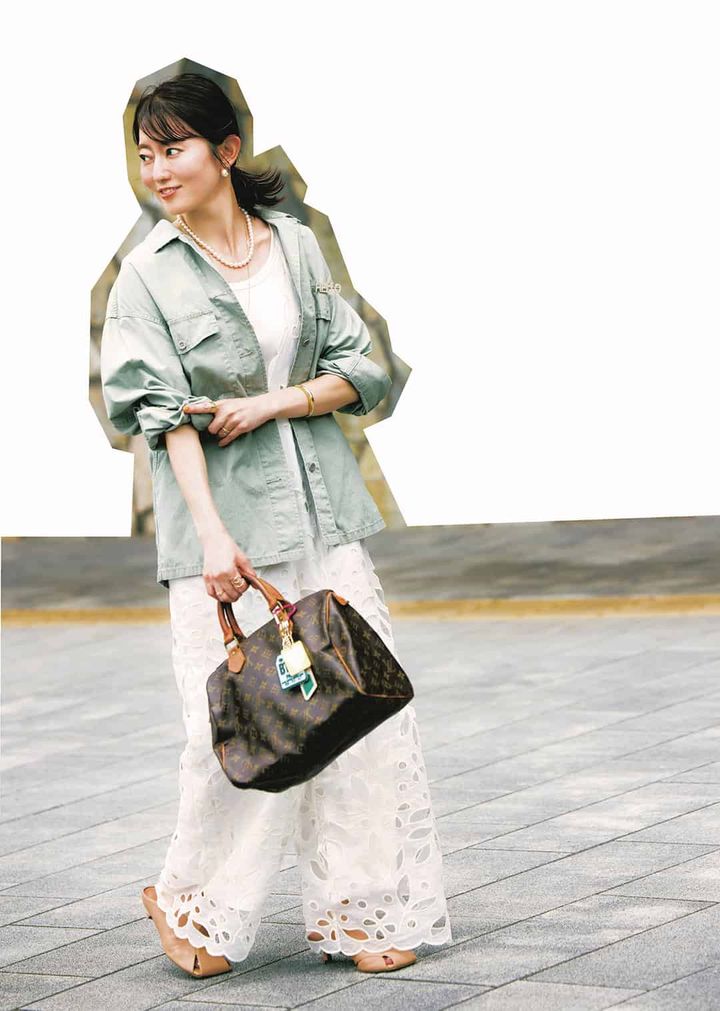 「女っぽいレースにマニッシュなミリタリーの意外性がツボ。シャツのブローチ使いやヴィンテージバッグ、オシャレ欲を満たすコーデ」