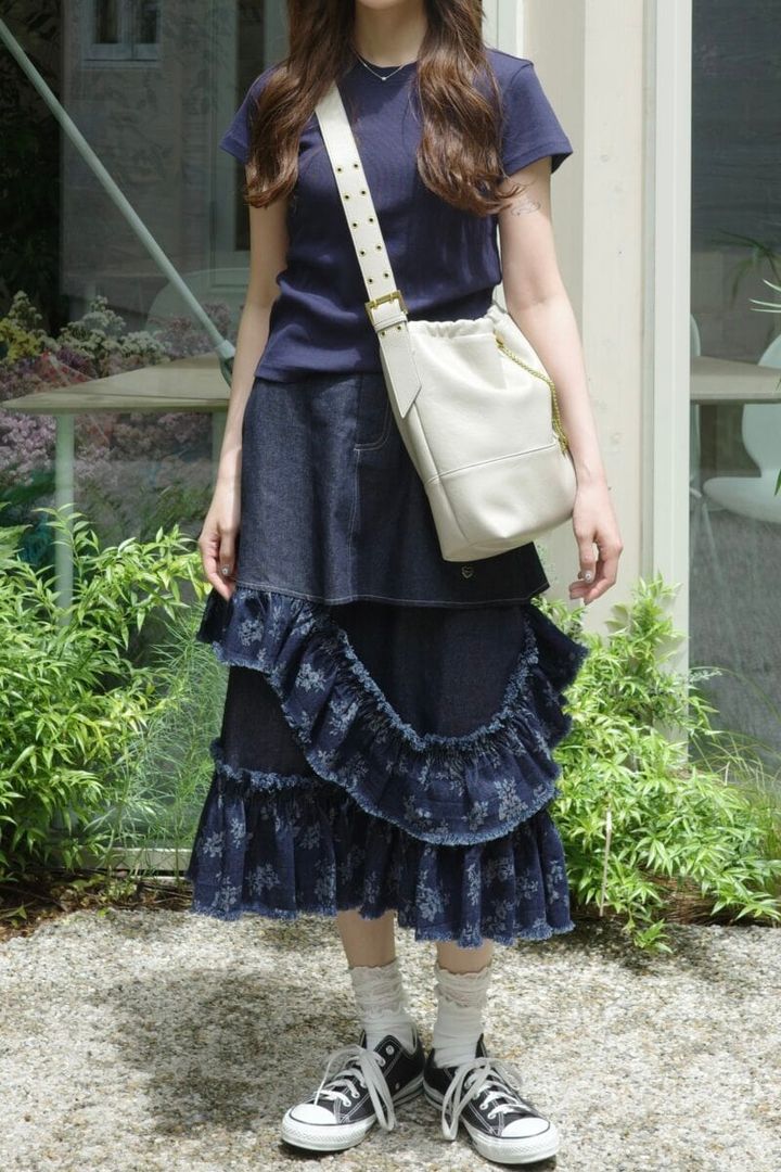花柄のティアードデザインが目を引くデニムスカートを主役にしたコーディネートをスナップ。足元やバッグには白を効かせて、清潔感のある印象に仕上げています。甘さとカジュアル感のバランスが絶妙で、30代でも取り入れやすいスタイルです。