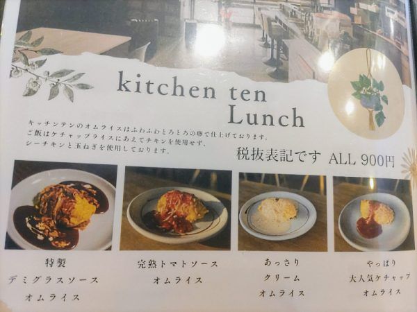 今日は、オムライスとイタリアンのお店「kitchen ten」をご紹介しようと思います。 余土中学校から松山中央公園に向かって左に曲がり、100mほど行ったところのマンション1階にあります。ランチはオムライス専門店、ディナーはイタリアンのお店として営業していますが、今回はランチのご紹介をさせて頂きます!