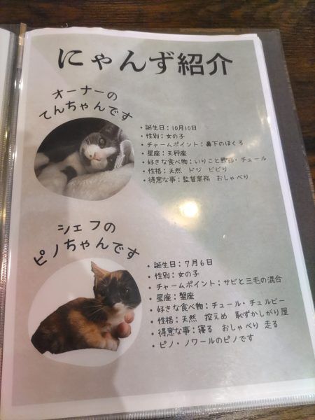 夜はイタリアンのお店をしているのもあってか、外観も内装もお洒落&アットホームな感じで癒されます。店内に入ると店長さんがいつも素敵な笑顔でお出迎え♪この店長さん、実はとっても猫好きで、店内いたるところに猫の写真があります。「オーナーのてんちゃん」と「シェフのピノちゃん」はお店のInstagramやメニュー表でも紹介されている看板猫。残念ながらお店で直接会うことはできませんが、お店のInstagramにはたくさん写真が載っているのでぜひ見てみてください。