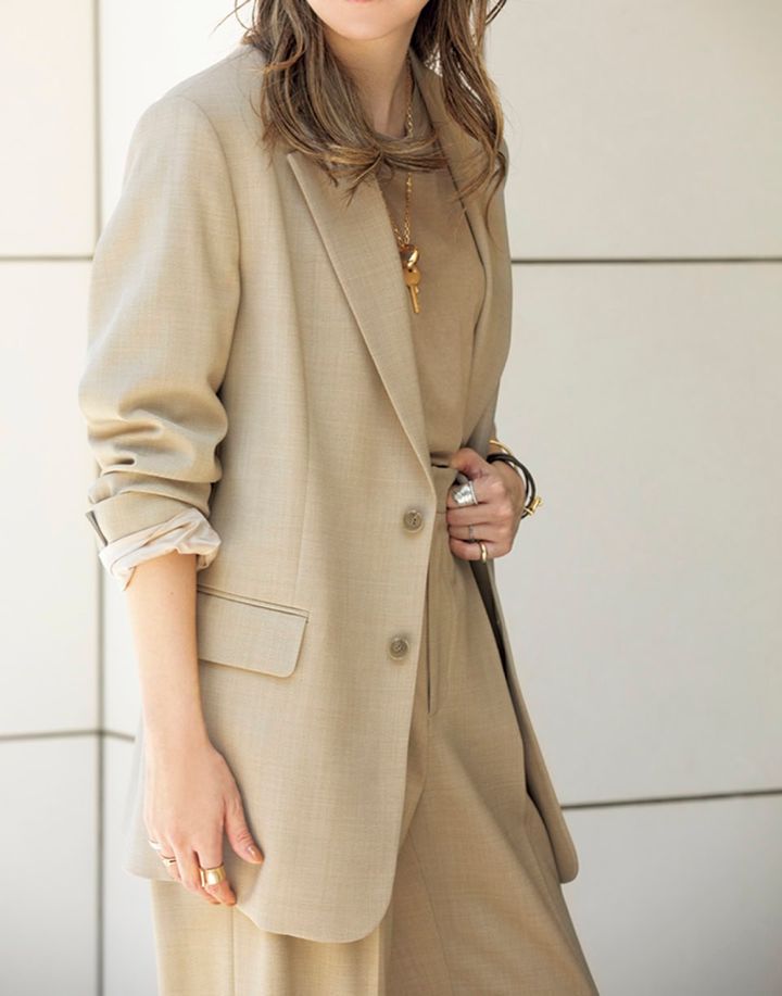 「計算し尽くされた程よくボクシーでモダンなシングルブレストのジャケットと美脚見えパンツが魅力。肌を明るくキレイに見せてくれるベージュの色合いも気に入っています」